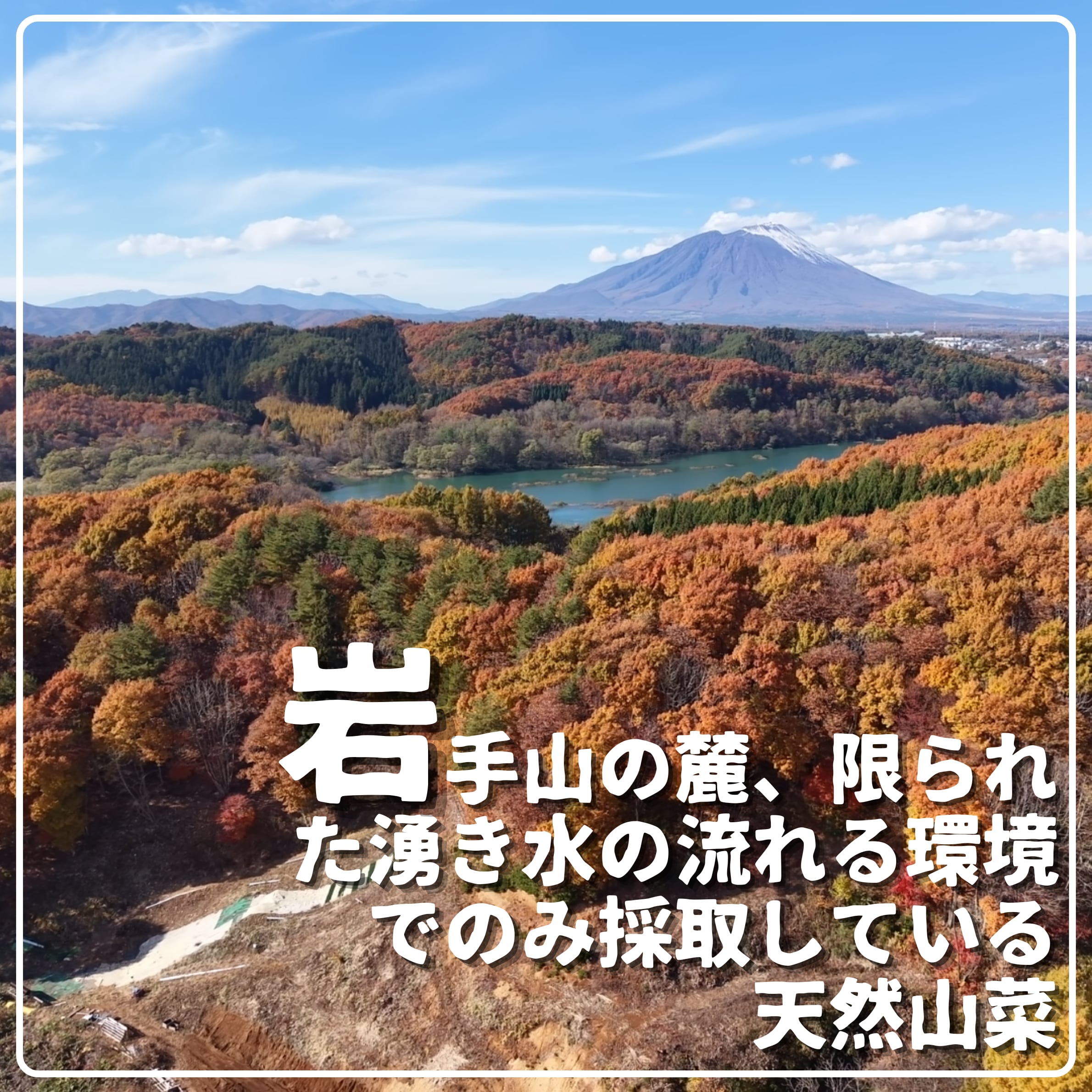 岩手山の麓、限られた湧水の流れる環境のみで採取している天然山菜。ミネラルを含んだ清らかな水に育まれ、雑味のない澄んだ味わいとしっかりとした香りを兼ね備えています。