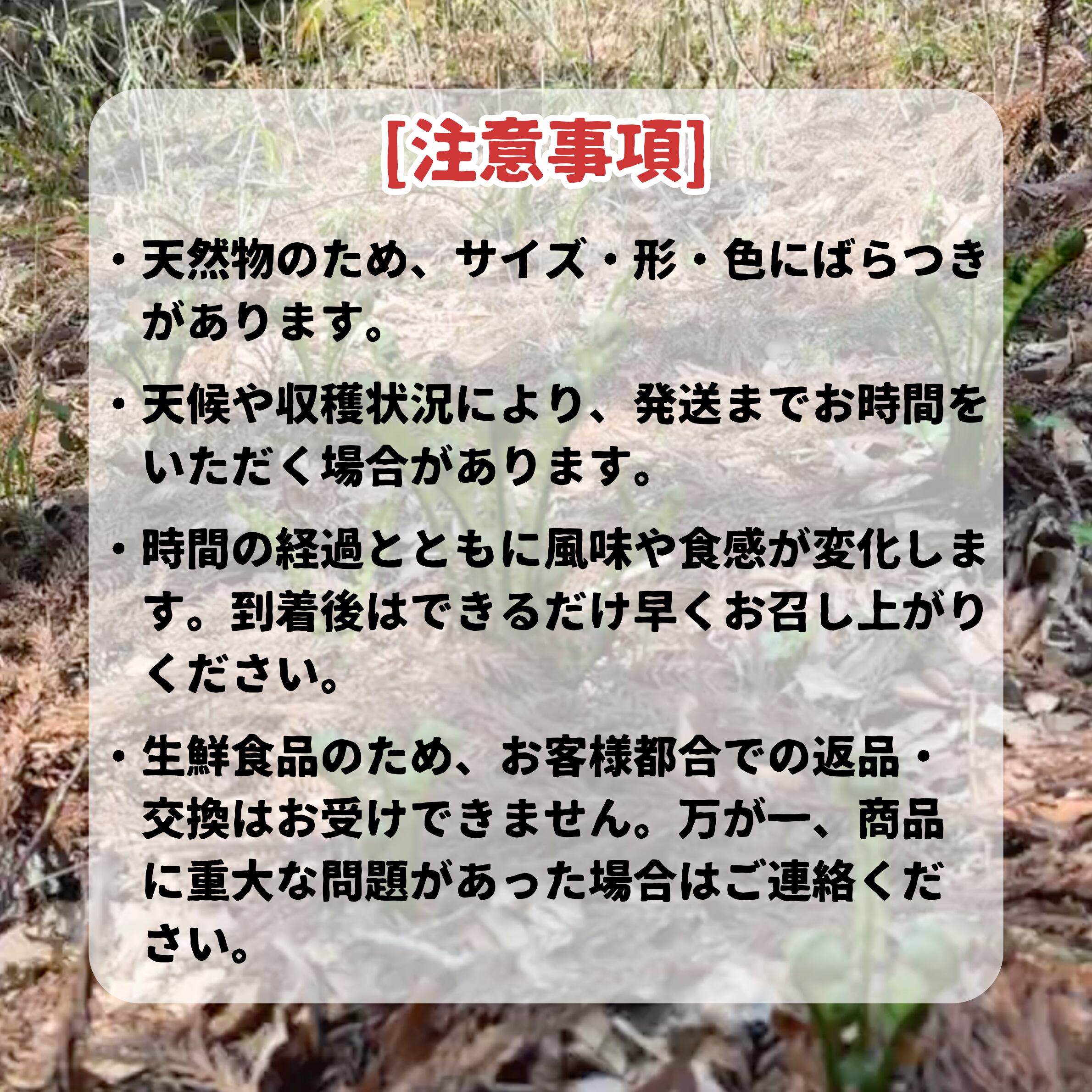 ・複数の商品(他種類の山菜)を同時にご注文の場合、一回分のみでお届けします。お得にお買い求めいただけます。